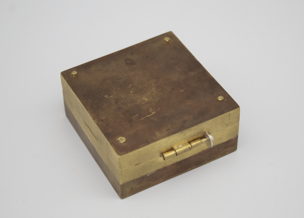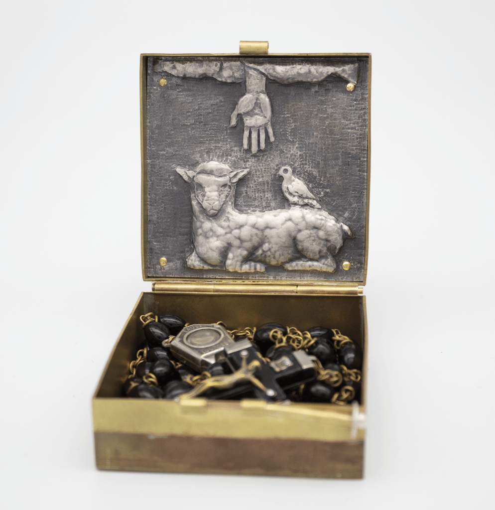 Custom fabricated rosary box with cradle hinge allowing the silver chased and repoussé plate to serve as a devotional image.