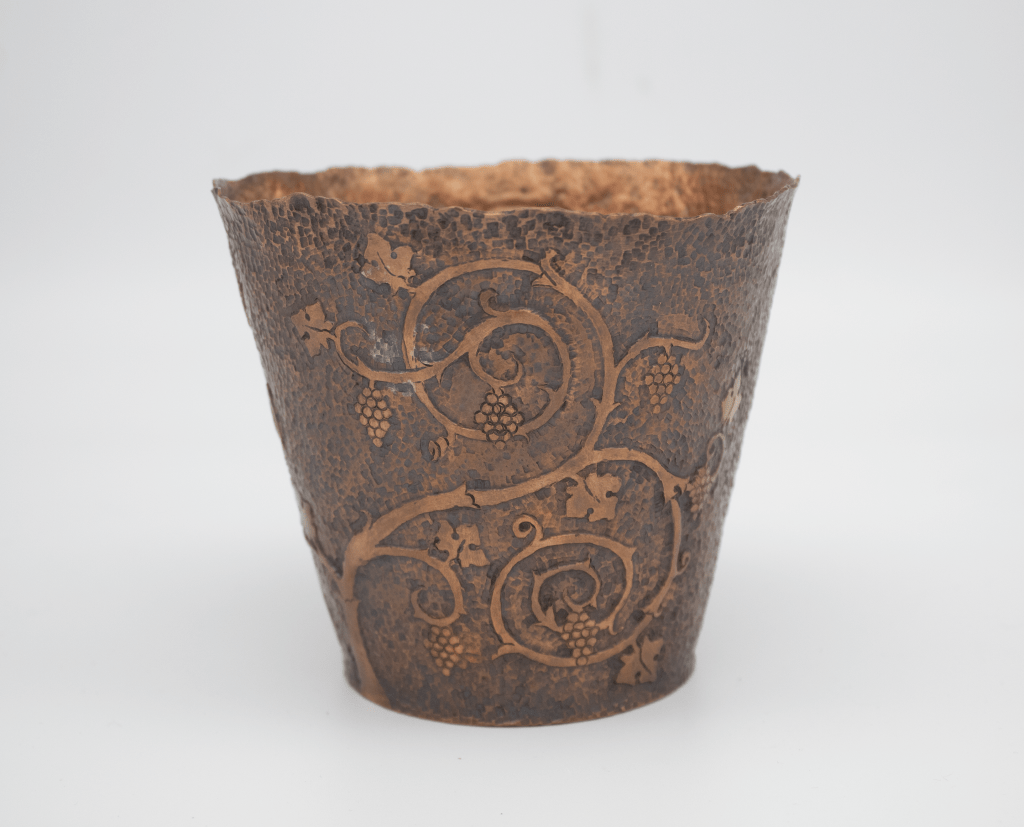 Raised and copper cup chased with grapevine design adapted from illustrated Bible.