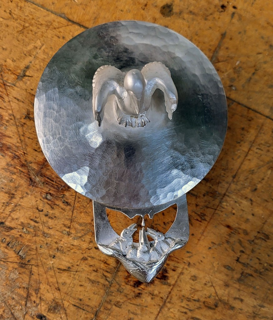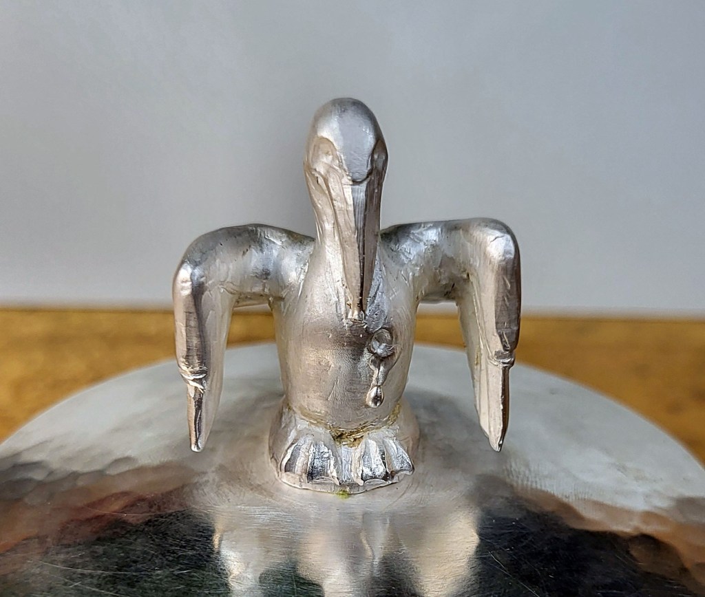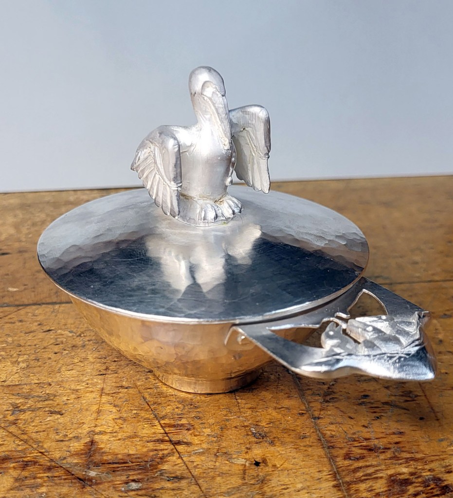 Vessel inspired by French ecuelles and porringers. It uses the one handed “bleeding cup” form, and employs the Christian motif of the pelican piercing its breast to feed its children.